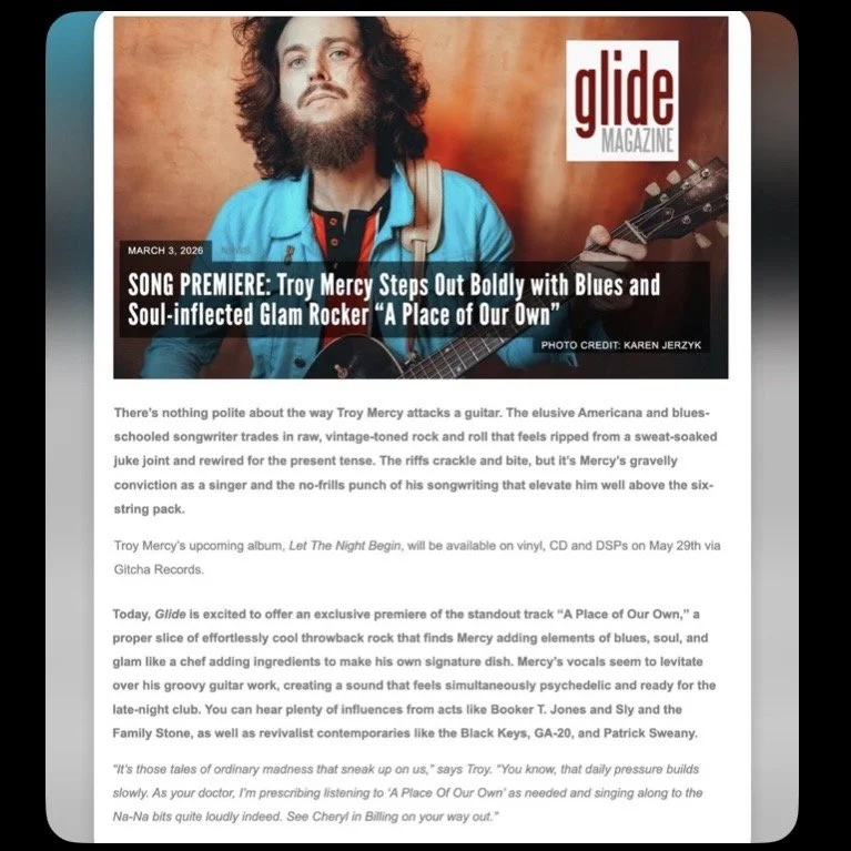 “There’s nothing polite about the way Troy Mercy attacks a guitar. The elusive Americana and blues-schooled songwriter trades in raw, vintage-toned rock and roll that feels ripped from a sweat-soaked juke joint and rewired for the present tense. The riffs crackle and bite, but it’s Mercy’s gravelly conviction as a singer and the no-frills punch of his songwriting that elevate him well above the six-string pack.